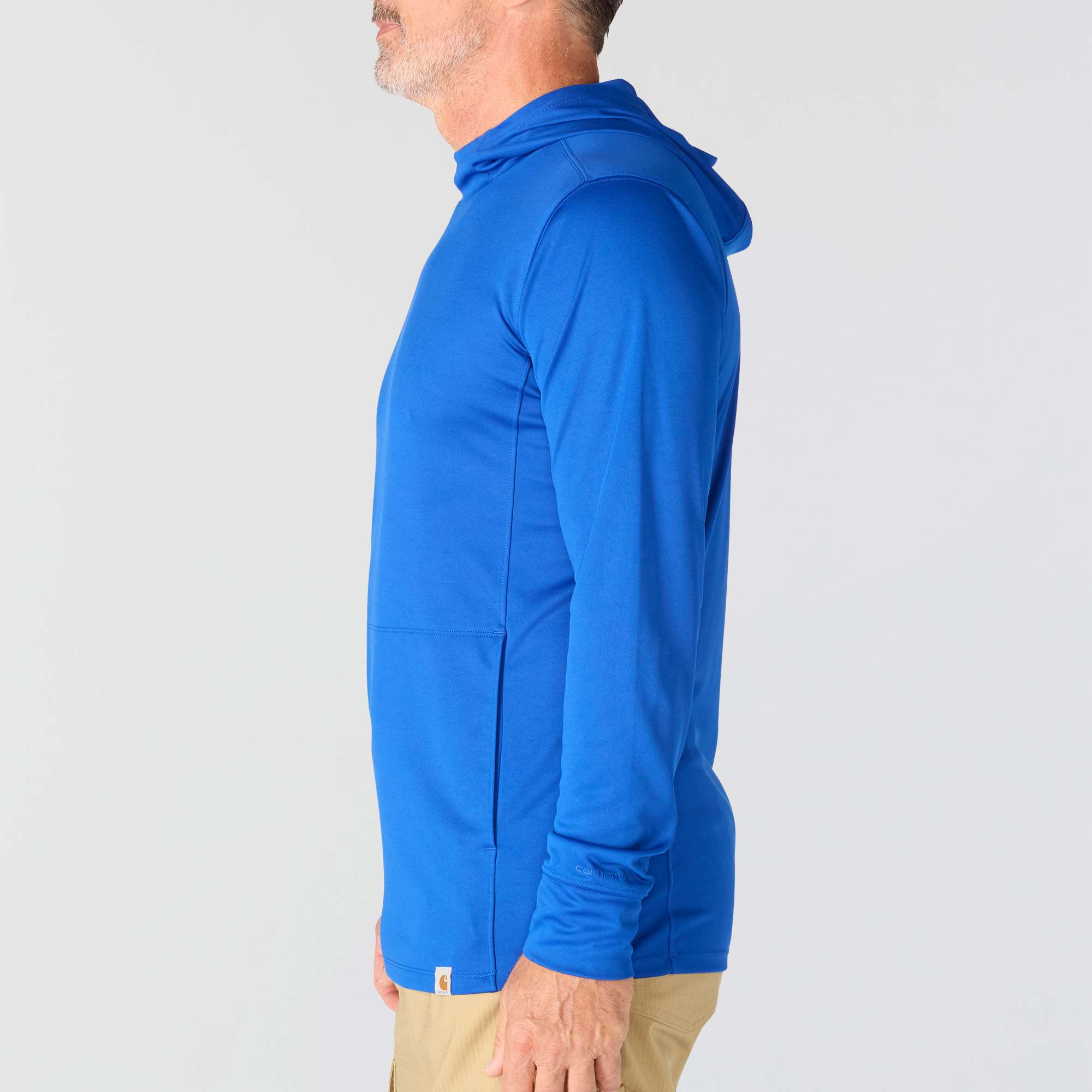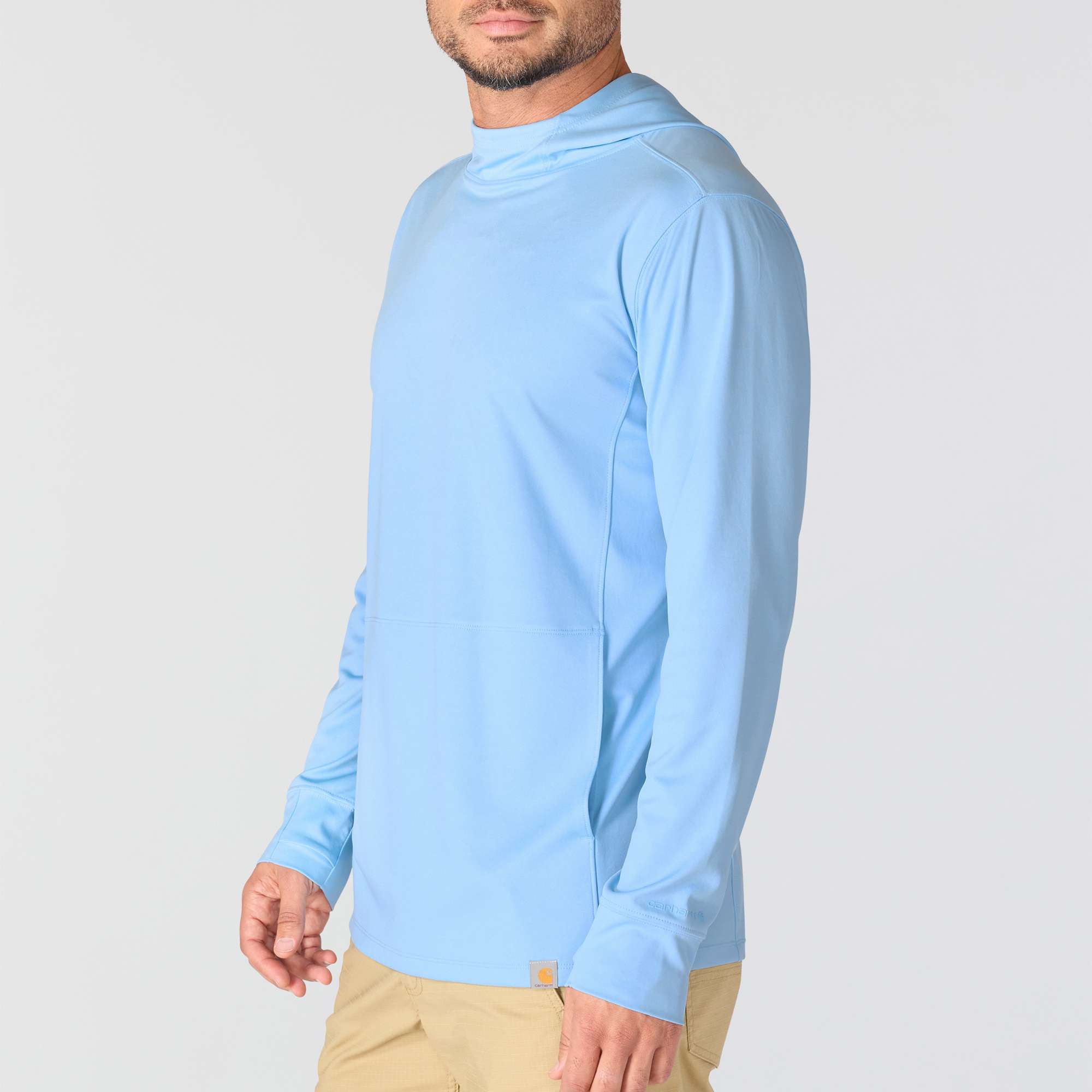 When long days in the sun are part of the job, this men's Carhartt long-sleeve hooded t-shirt gives your crew the coverage they need to work through hot weather. Built-in UV protection, plus sweat-fighting and anti-odor properties, keep workers comfortable. Thumbhole sleeves, a high neck, and a hood provide extended coverage. Featuring